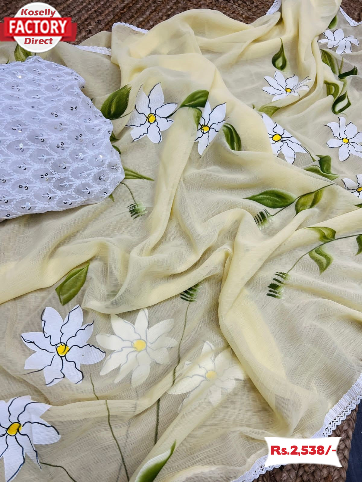 *Chiffon silk saree with handprint in saree with beautiful border of Chikankari lace also attached with Chikankari sequins blouse of Georgette fabric *🍁🌺