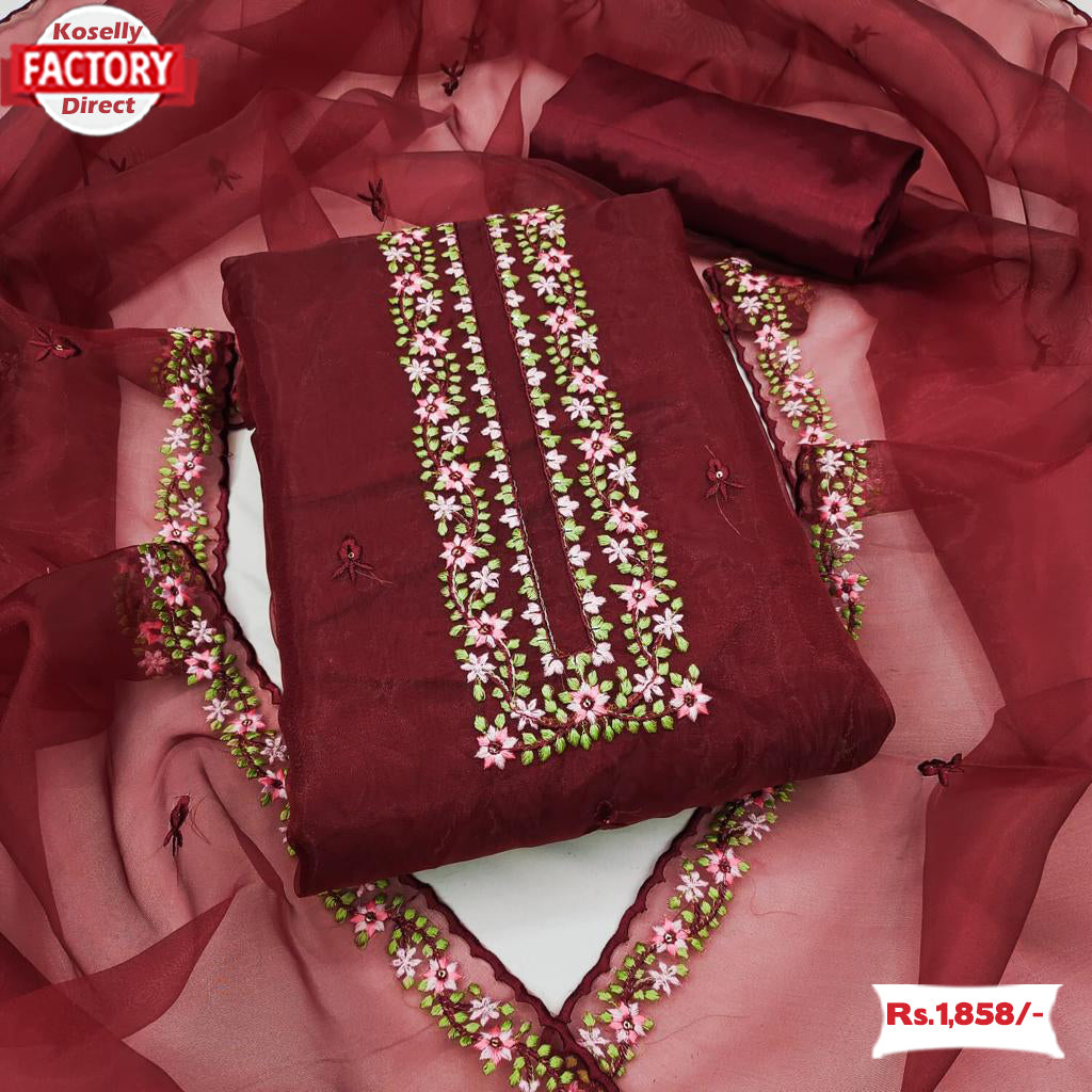 Maroon Organza Multi-Embroidery Kurtha Suruwal Piece