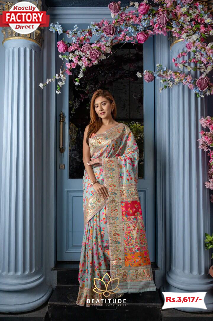 Work :-Kashmiri Weaving Multi-colour thread weaving pure zari saree