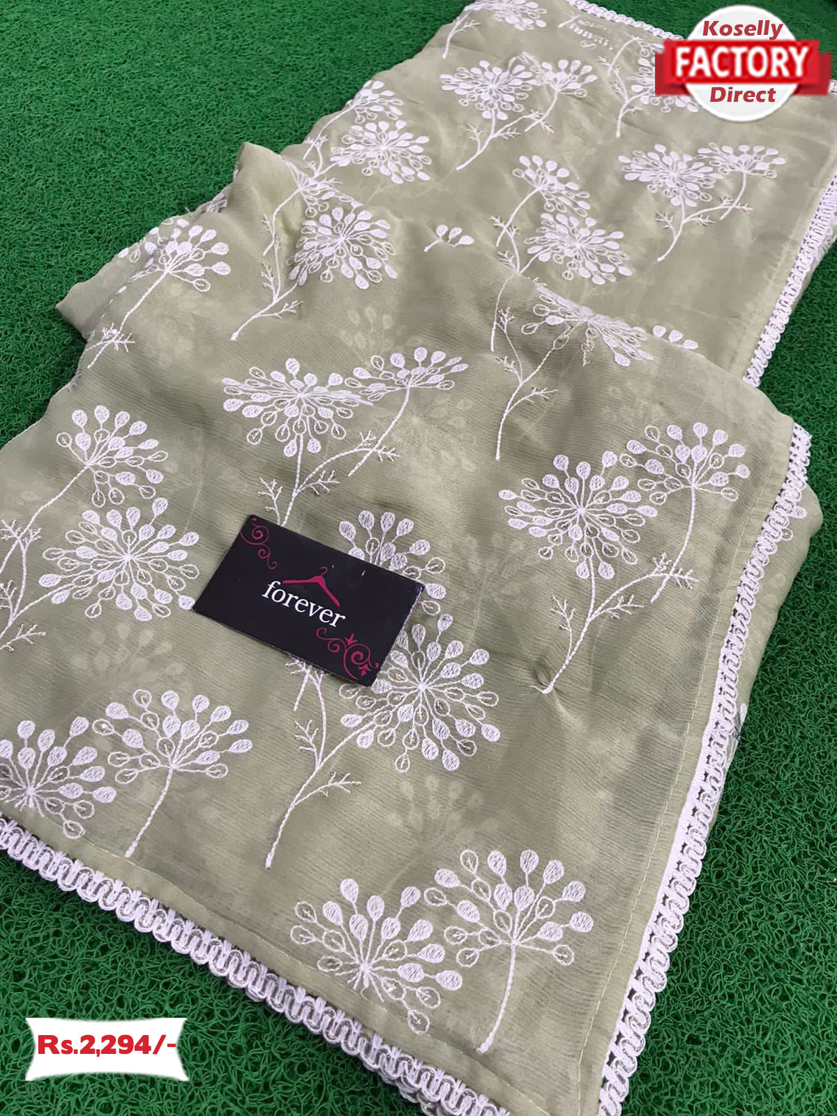 Pure Chinnon Silk Saree with embroidery sequins work with lcknowi lace and raw silk stitched blouse (Size Up To 42)