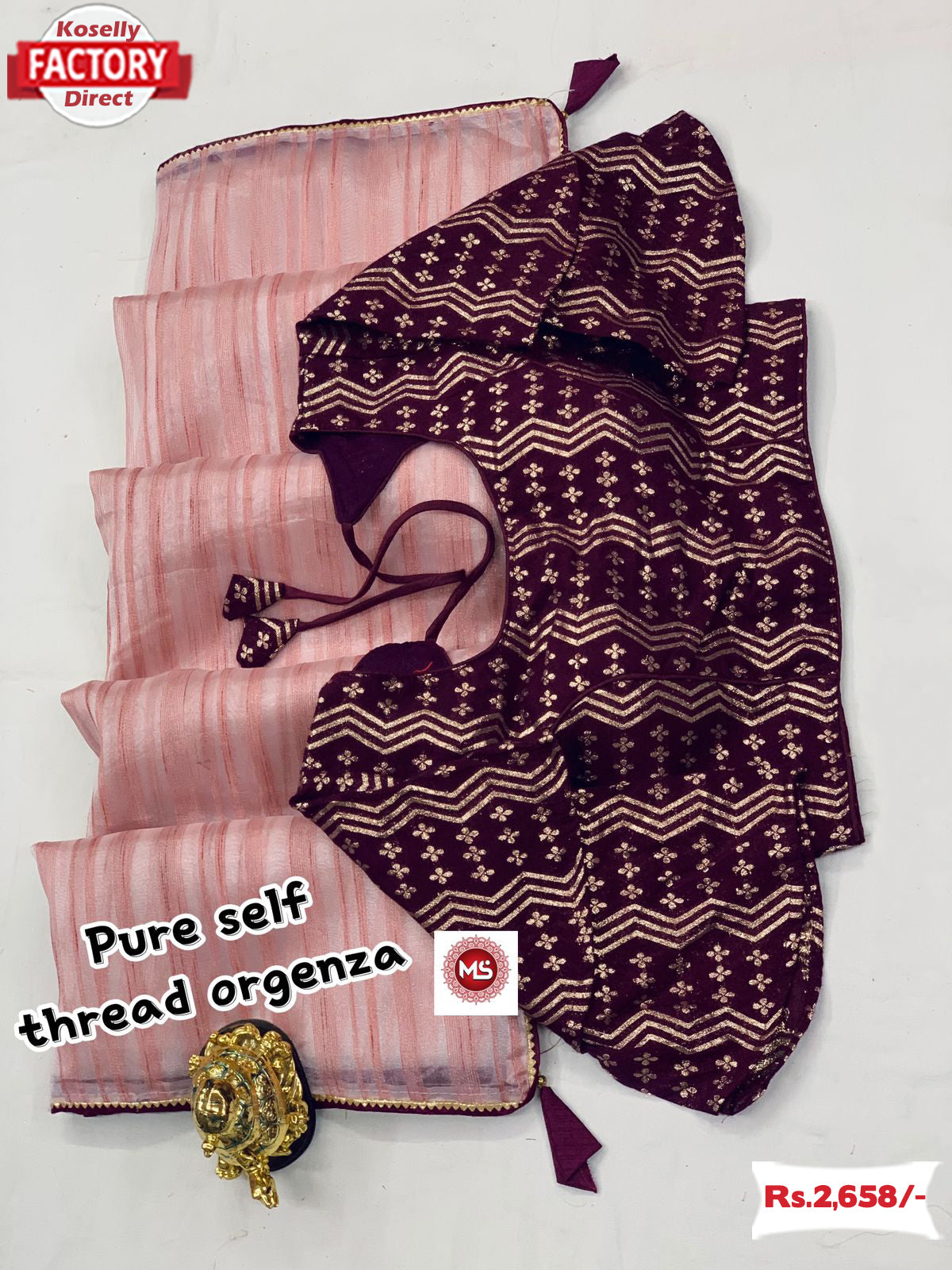 Organza self thread fabric soft and nice quality party wear saree with simple and rich look with contrast stitched blouse. Soft and smooth fabric with rich look concept on silk base with piping and beautiful latkans in pallu😍