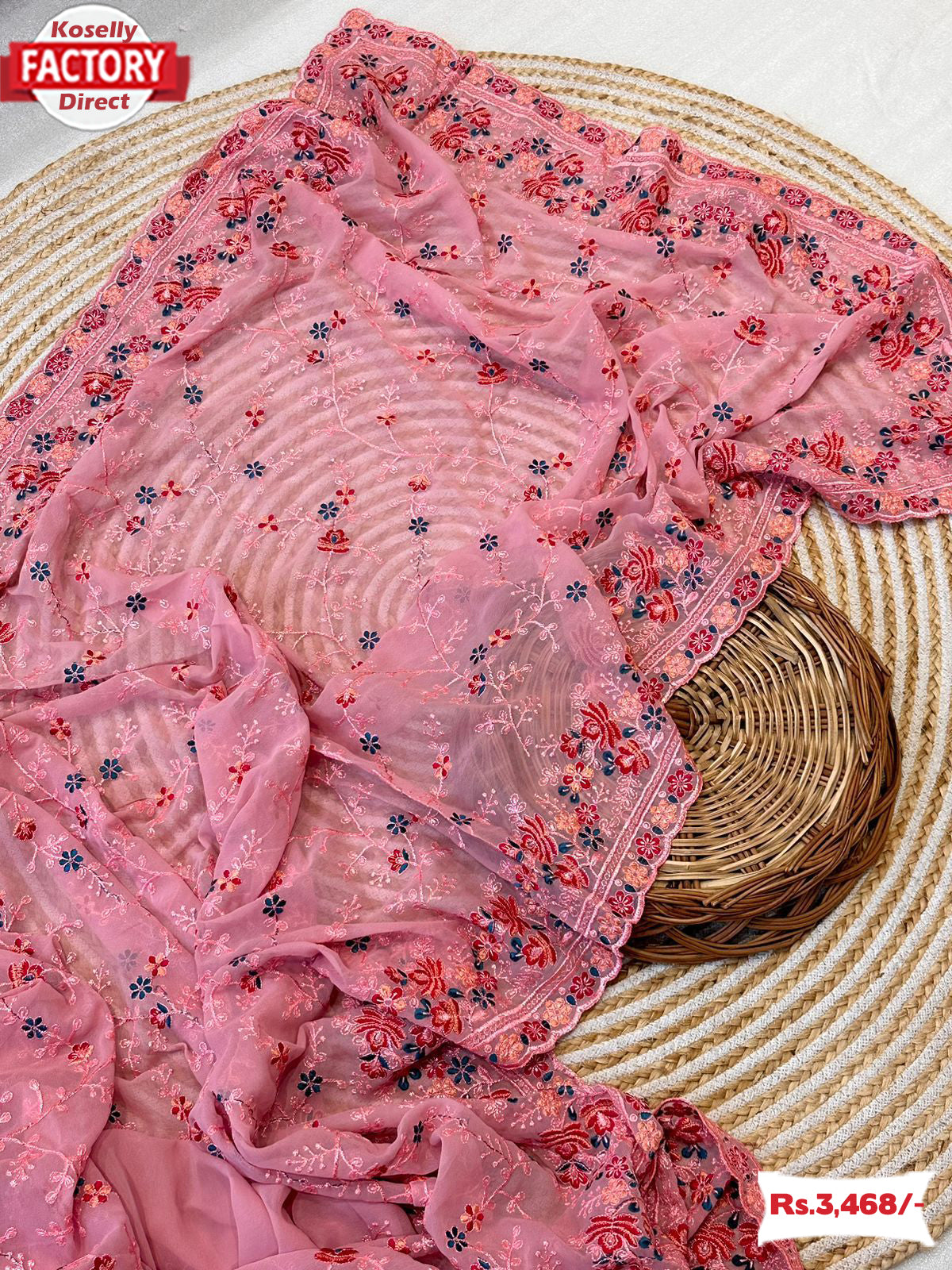 Beautiful soft georgette saree with viscose thread work of zari dori and also multi-color thread work paired with pretty raw silk blouse.