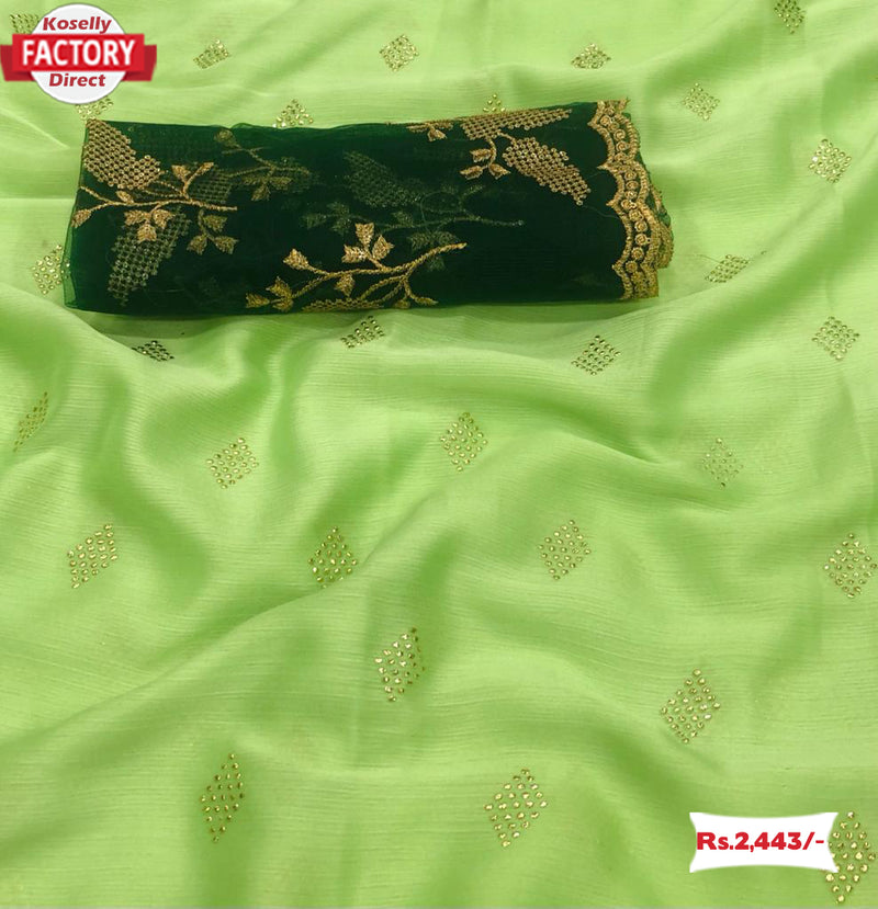 Beautiful pure chiffon sarees with exquisite mukesh work for extra styling. Comes with unstitched net embroidered blouse. Perfect for parties and special events.