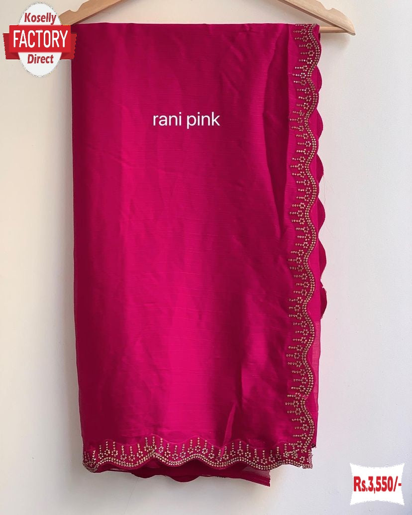 Rani Pink Pure Chiffon Saree With Velvet Zircon Cut-work Border