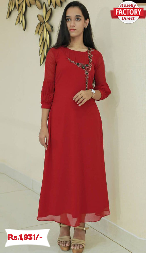 This Georgette Kurti is featured with hand embroidery beads work on Yoke portion. We have given pleats pattern in yoke and sleeves.