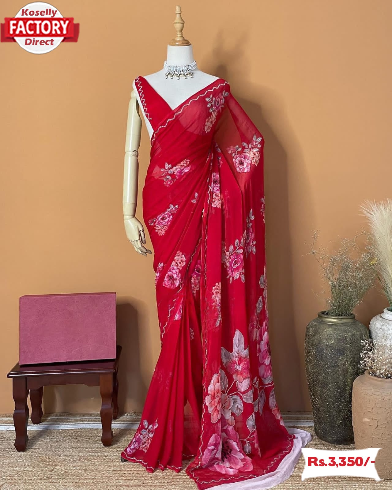 Red Pure Georgette Silk Floral Handwork Partywear Saree