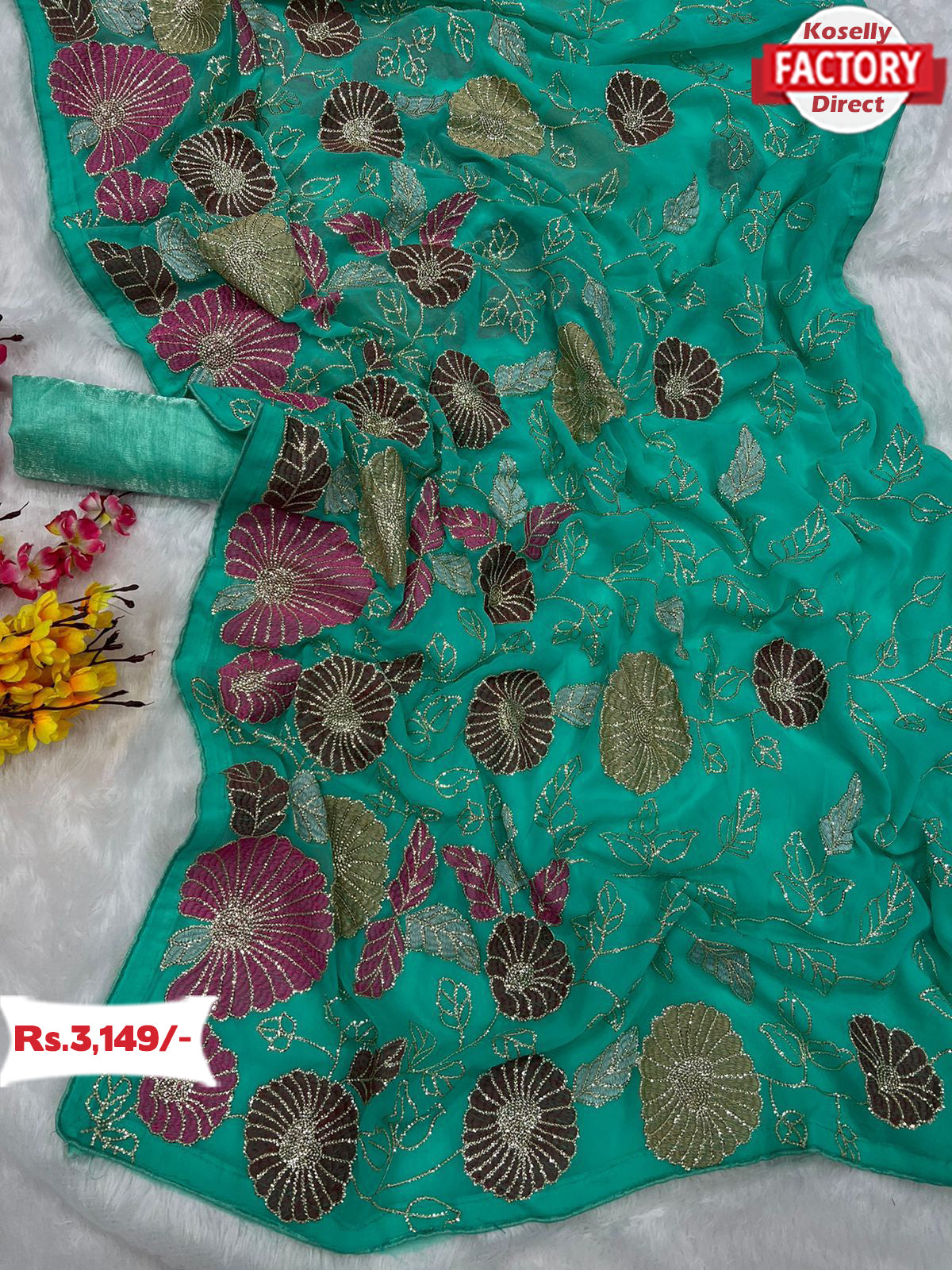Sea Blue Partywear Georgette Heavy Embroidered Saree
