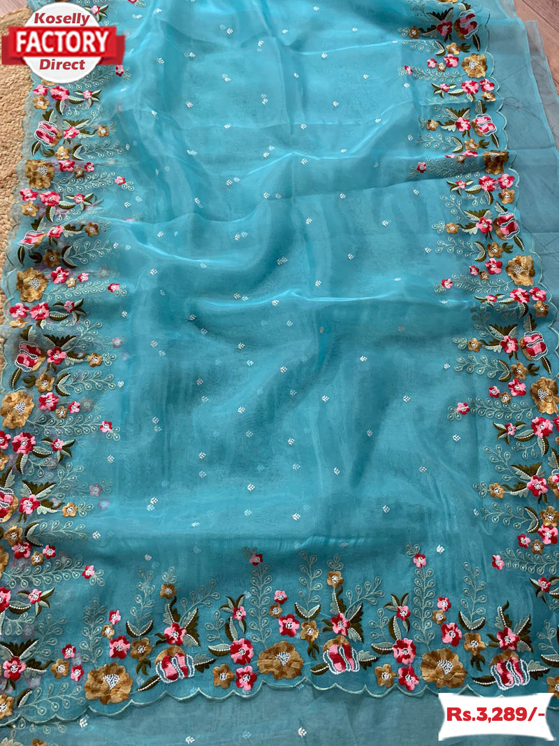 Sky Blue Multi-thread Embroidery Work Organza Saree