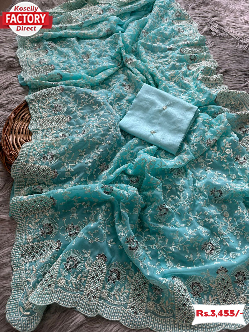 💐Fabric : Premium georgette with excellent colour combinations with extraordinary artistry of sequins and multi-thread work. Comes with satin border blouse work.
