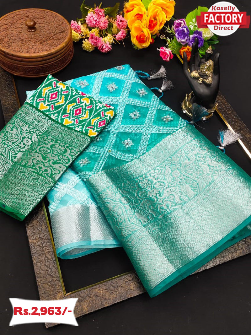 Organza Kora silk viscose embroidery saree with square mirror diamond work ♥️