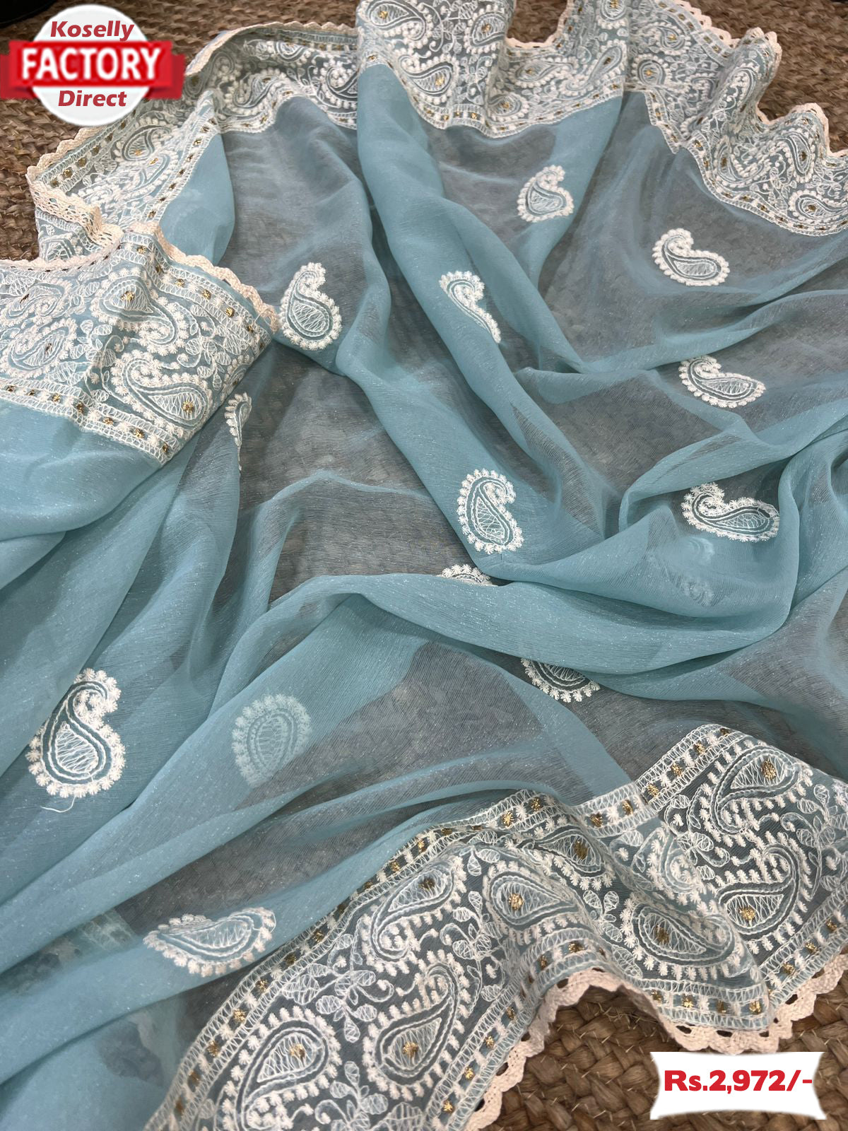 Sky Blue Shimmer Silk Saree With Chikankari Work