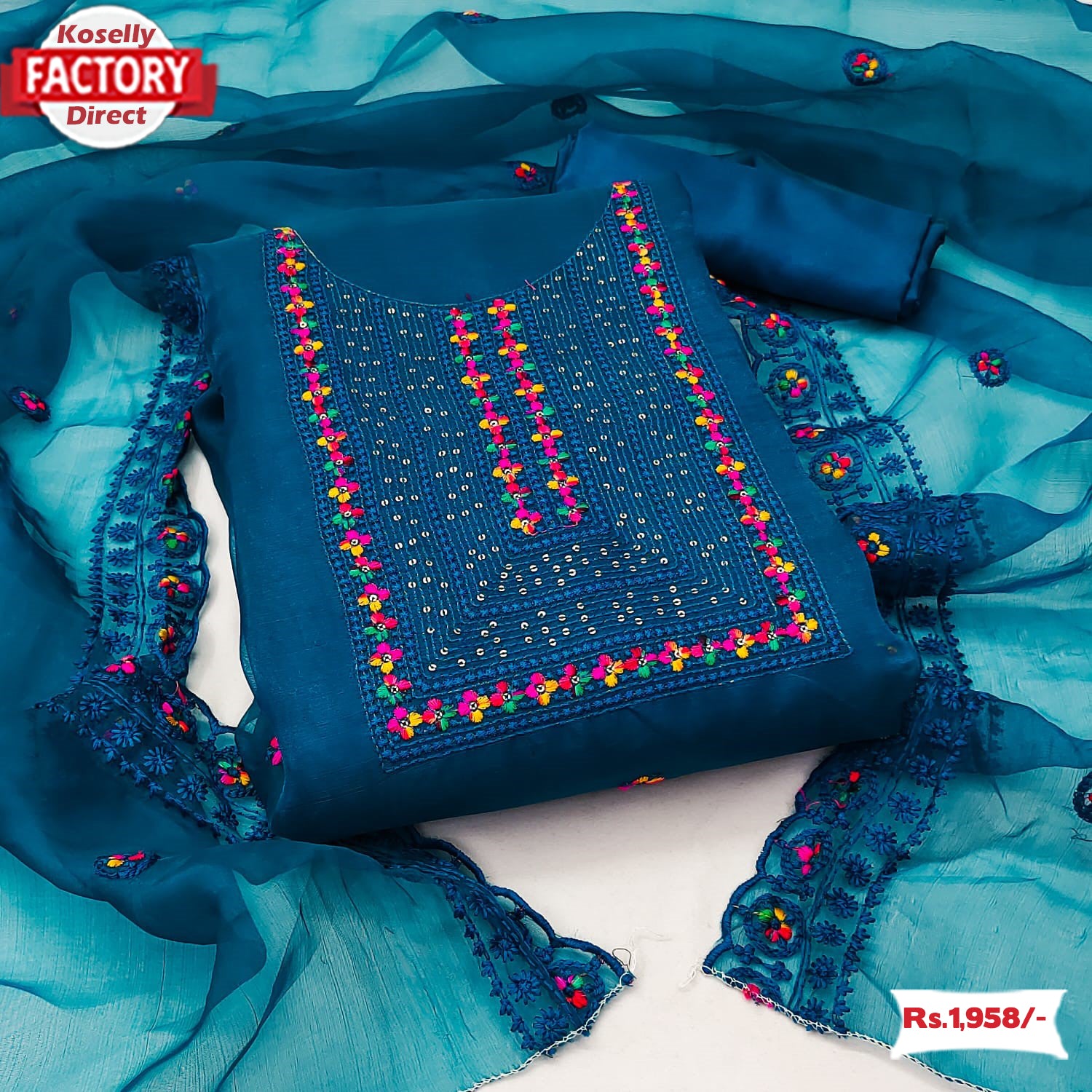 Teal Blue Organza Embroidered Kurtha Suruwal Piece