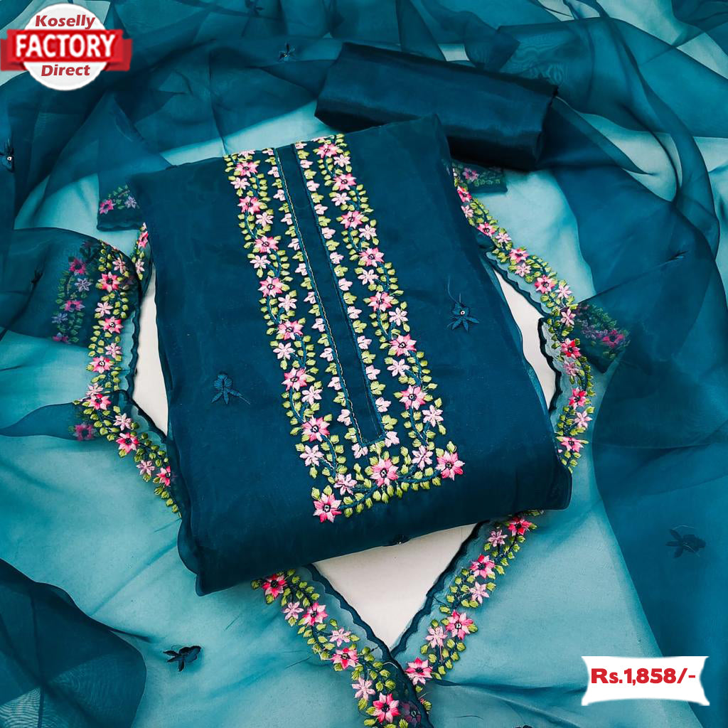 Turquoise Organza Multi-Embroidery Kurtha Suruwal Piece