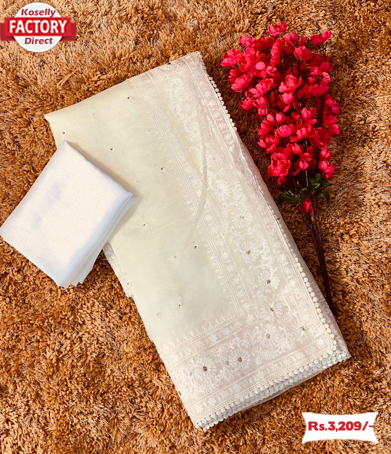 Organza saree with beautiful lucknowi embroidery (4.5 mtrs embroidery) all over saree with beautiful cotton candy lace and silk white blouse ( un-stitched )