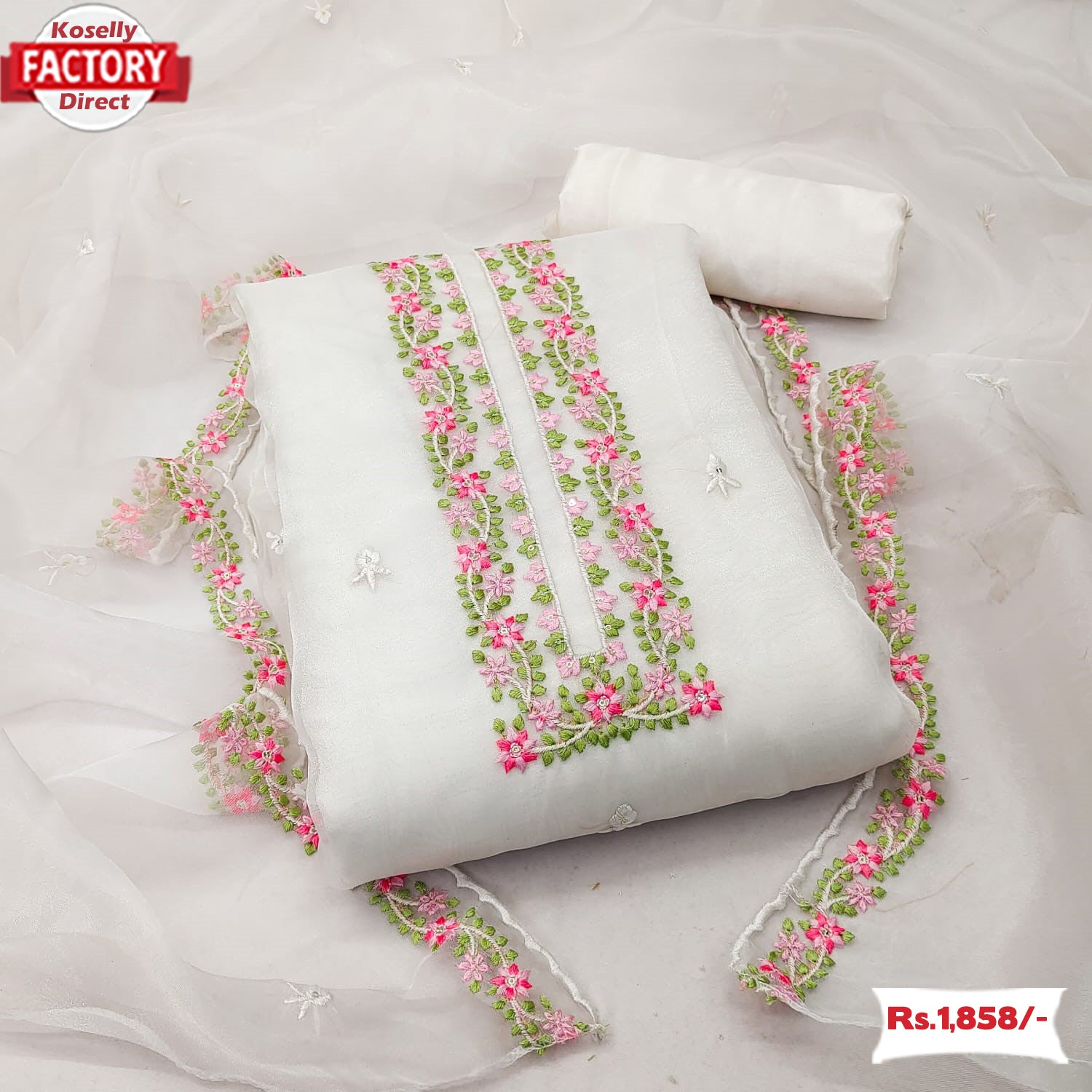 White Organza Multi-Embroidery Kurtha Suruwal Piece