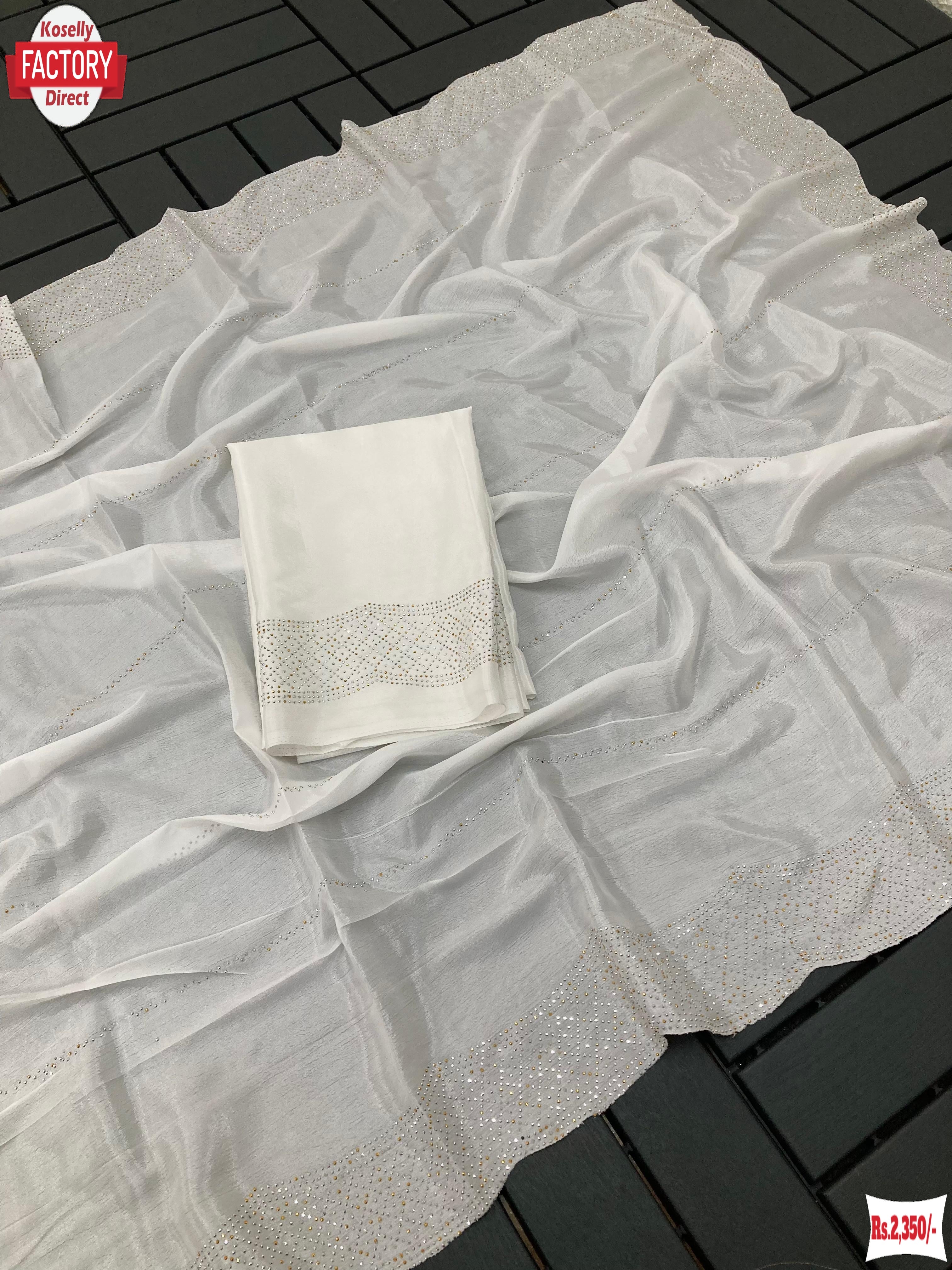 White Pure Chinnon Silk Partywear Saree With Stone Work