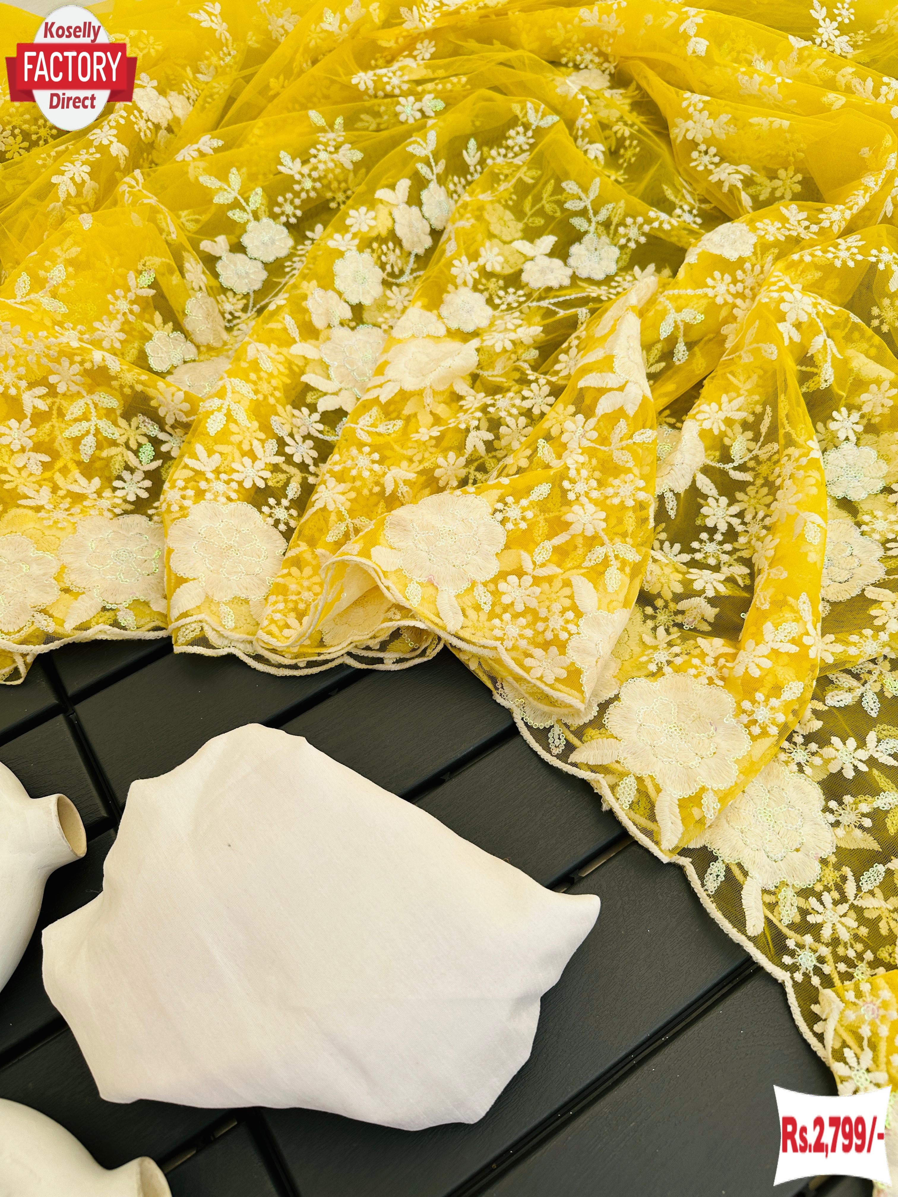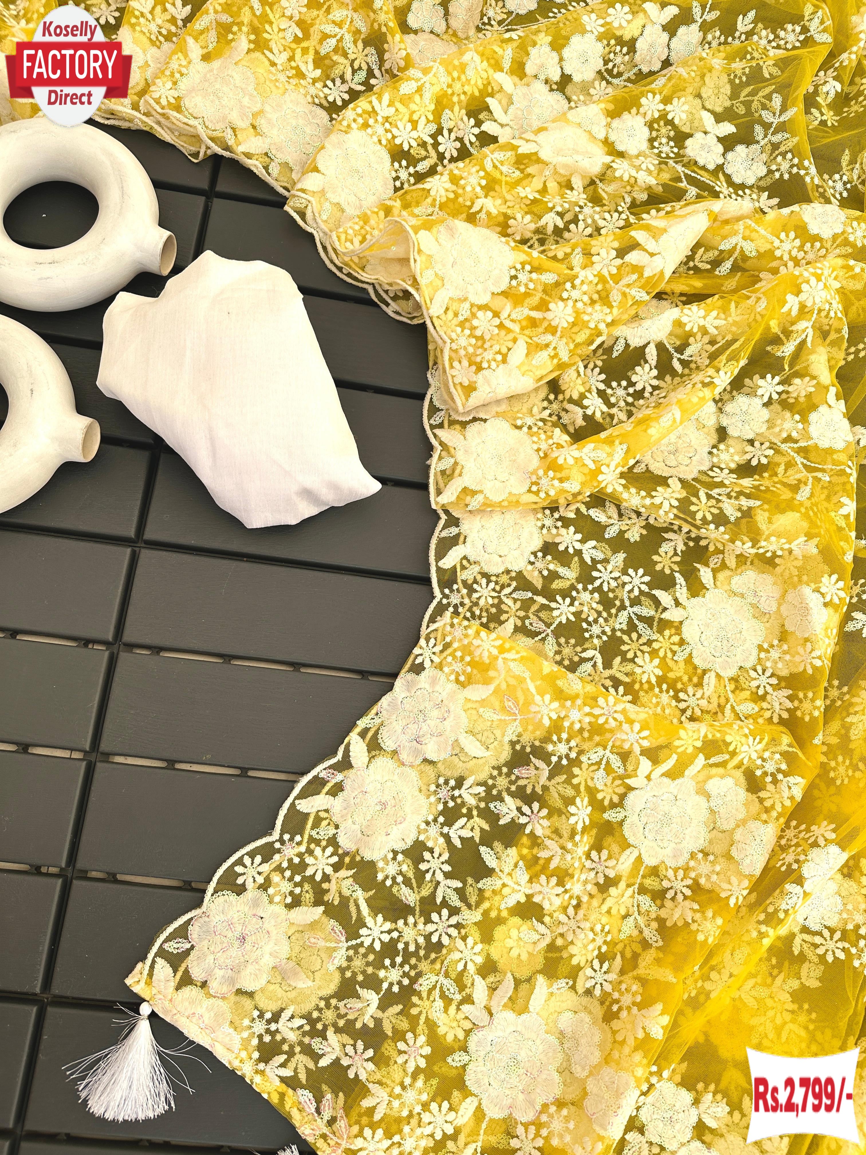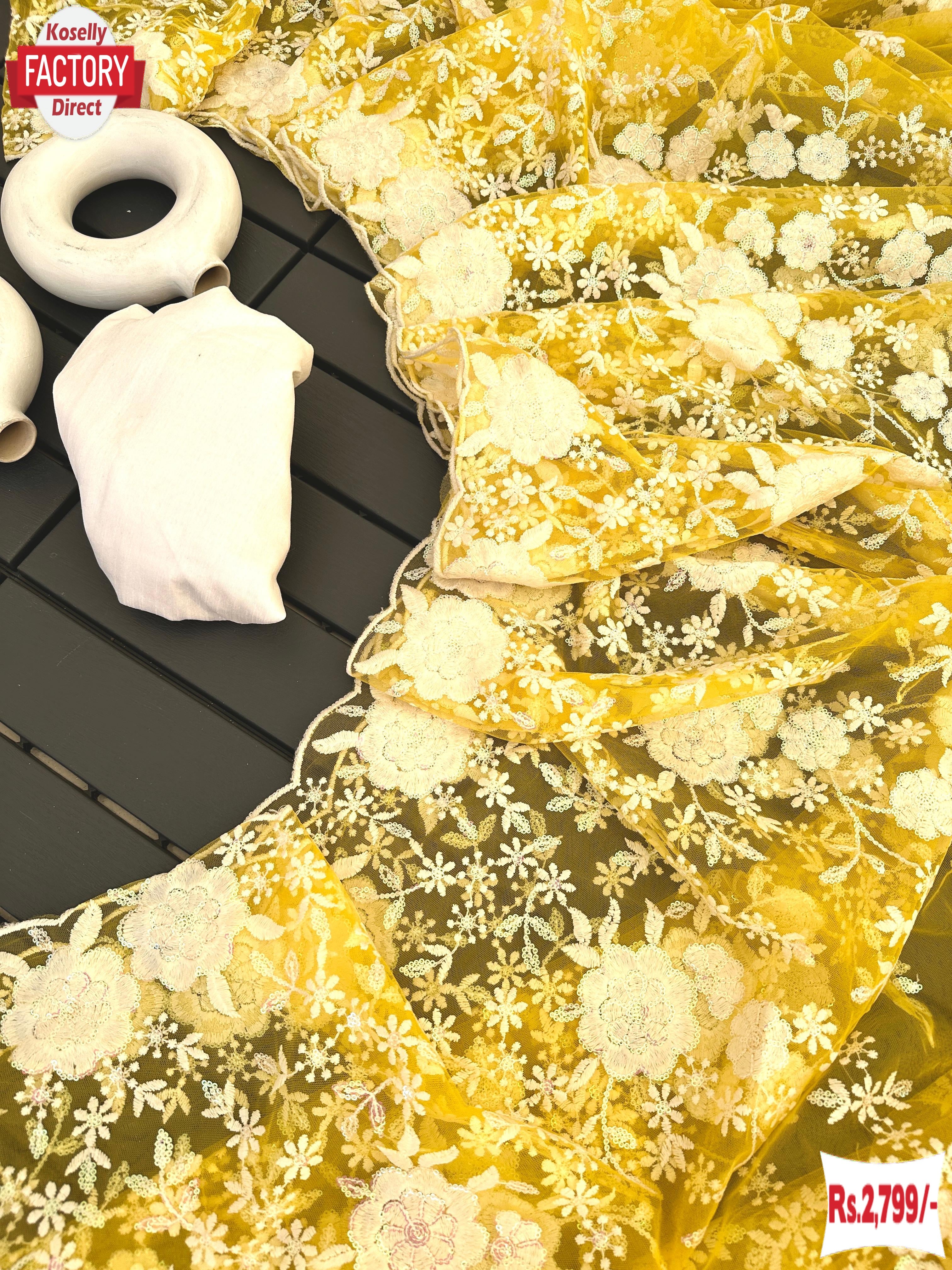 Yellow Heavy Net Thread And Sequins Work Fancy Saree