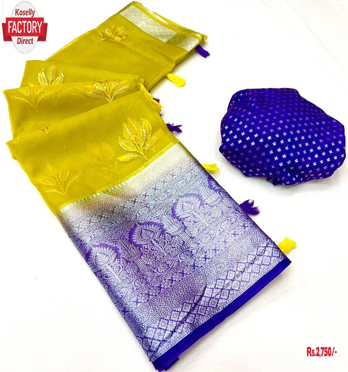 Yellow Organza Kanchipuram Saree With Fancy Embroidery Work