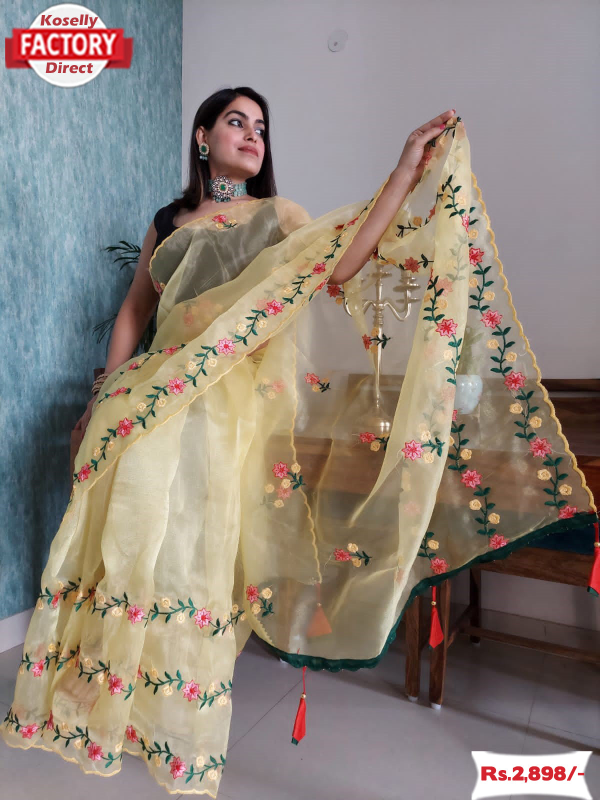 Yellow Pure Organza Embroidered Saree