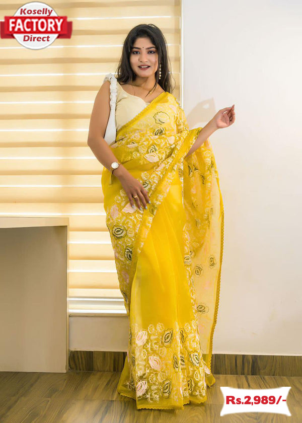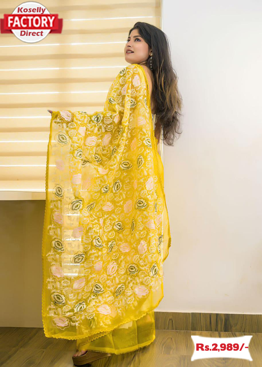 Yellow Pure Organza Lucknowi Chikankari Saree