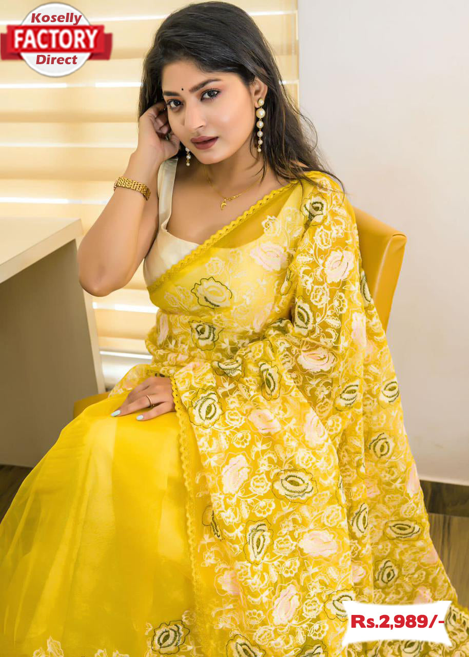 Pure organza silk with lucknovi work flower design sarees with tone to tone lace and matching silk white blouse.